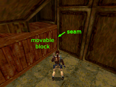 If necessary, push or pull the movable block so there are empty spaces on the side where Lara is standing and on either side beyond the block (as shown in the diagram above and screenshot 1). Depending on what's beyond the block, you may be able to see light through the vertical crack between the block and the wall or see through to the other side by standing close and using the Look button.