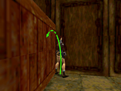 Now just run forward. If you've set it up correctly, Lara should run straight at the point just to the left of the corner seam... (screenshot 4)