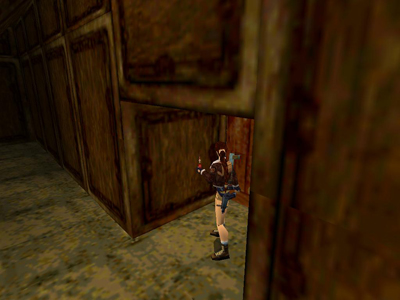 This variation on the fence bug was found by Joe C. and reported on tombraiders.com. It works in Tomb Raiders 1-3 in most locations where there is a concave corner in a fence or balcony (i.e., a thin texture with regular seams and open space on the other side).
