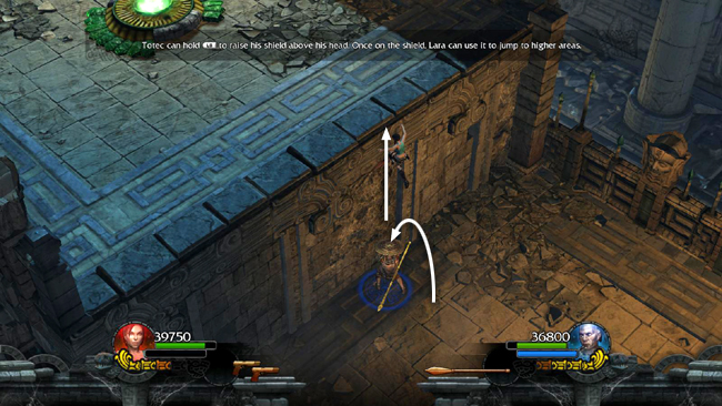 Totec's shield can also be used to lift Lara to higher places. The player controlling Totec should raise his shield. The player controlling Lara can then jump on top of it and then jump to grab the ledge above and pull up onto it. (screenshot) Lara should then extend her grapple down to Totec so Totec can climb the cable onto the ledge. (screenshot)