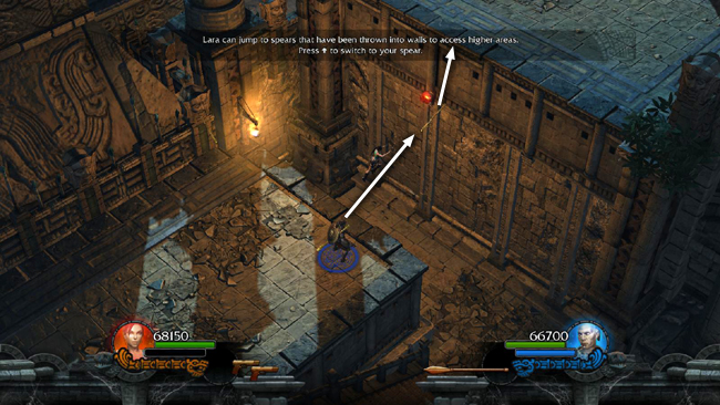 Once Lara is between the gates, the player controlling Totec should shoot the target again to re-open the inner gate. Then move into the space between the gates himself, throw a spear into the wall and then move out again and shoot the target once more to rearrange the gates. Now Lara can use the spear to reach the HEALTH UPGRADE on the ledge above.