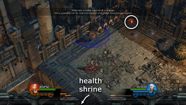 The glowing green light is a HEALTH SHRINE. Stand on it to replenish your characters' health if they were injured in the recent fight. Be sure to smash the 3 urns for the Reward Challenge.