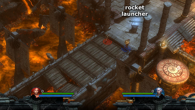COLLAPSING BRIDGE: Move quickly across the rickety wooden bridge, which drops out from under your characters as they pass. Take the ROCKET LAUNCHER from the pedestal and equip it. (screenshot) When you acquire the weapon, the camera shifts briefly to show an AMMO CACHE at the bottom of the lava pit in the center of the room.