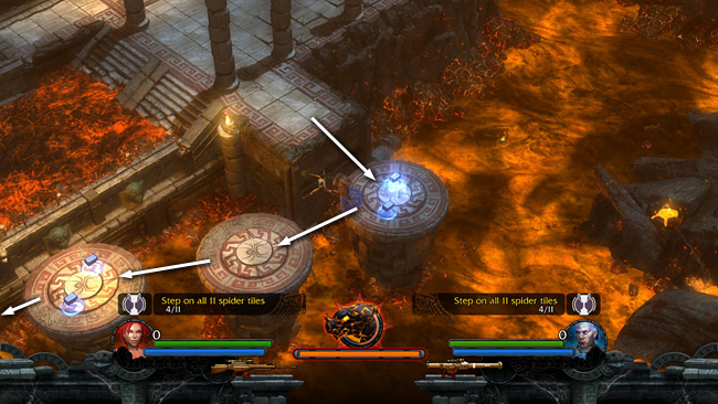 To beat the first Reward Challenge: Step on all 11 spider tiles, all you need to do is jump across each of the round pillars sitting in the lava pool along the edges of the room. When you step on each pillar the spider tile on top glows blue, showing that it's been activated and the on-screen counter pops up displaying the total so far. There are 3 pillars each along the NE, SE and SW sides of the arena, and 2 on the NW side. When you activate all of them, you'll get a White Drum Artifact (+ defense, + speed). (One set of pillars is shown in this screenshot. The rest are shown in the screenshots for red skulls 7-10, below.)