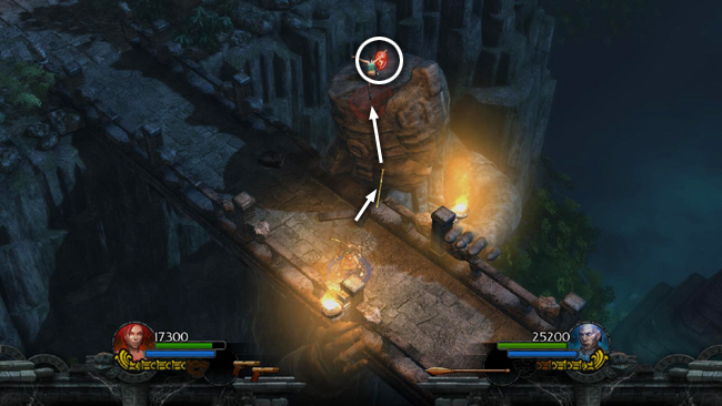 Return to the NW to the road with the burning trucks where you fought the shamans. When you step out onto the bridge, 2 enemies attack. Deal with them and continue forward. At the gap in the bridge, hop down onto the ledge below and have Totec throw a spear into the wall so Lara can climb up. Then she can extend her grapple down to Totec so he can climb up. A bit farther along, you'll see a huge statue supporting the bridge. Totec: Fire a spear into the statue. Lara: Climb onto its head to find red skull (3/10). (screenshot) Drop down and continue to the end of the bridge.