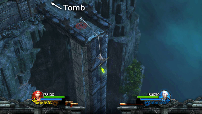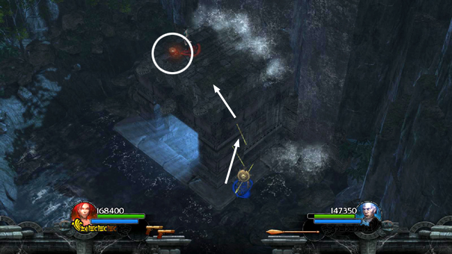 If you strike out to the SE, you'll come to a broken walkway jutting out over the cliff side. Have Lara grapple Totec so he can rappel down the wall to retrieve a HEALTH UPGRADE. (screenshot)