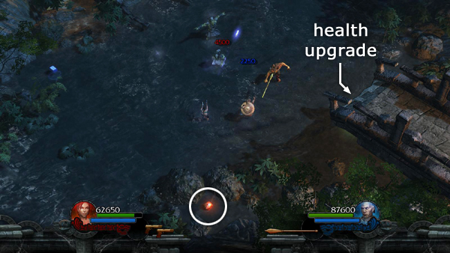 Afterward you'll find various health and ammo pickups nearby. (Some are planted and some are dropped by the ogres.) There's also a red skull (5/10) sitting inside a ring of rocks near the raised end of the broken bridge, a HEALTH UPGRADE concealed beneath the SE end of the broken bridge (screenshot), plus various gems scattered along the river bottom. Just take care not to go over the waterfall at the SW end as you explore.