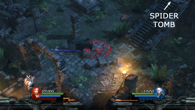 AREA WEST OF SPIDER TOMB: Another ambush awaits you here, with enemies large and small converging on the clearing at the bottom of the stairs. A few also come down the stairs from the tomb area. When you've beaten them all, explore the area at the bottom of the stairs, picking up various gems in the grass and on the dais to the NW, health packs to the right of the stairs and behind the wall to the NW, plus any health/ammo the ogre may have dropped.