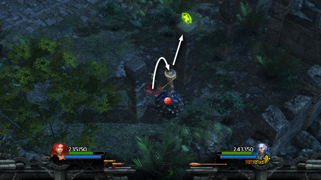 The TNT crates in the open area to the ahead can be used strategically in the next fight, so don't destroy them yet. Start up the long flight of stairs to the NE. After a few steps, you'll hear a rumbling as a large stone ball rolls down toward you. Quickly run down and dodge out of the way. Have each player plant a bomb at the base of the stairs and prepare for a massive ambush.