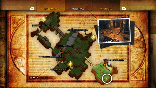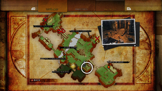 SOUTHWESTERN TOMB & UNDERGROUND PASSAGE: This tomb (labeled "Sun Disc Tomb Entrance" on the level map and shown just to the left of the waterfall) contains a bull's-eye target that controls 2 barriers made of giant spiked pillars. Shoot the target so the first barrier comes down and the second rises. Plant a bomb next to the target, move into the space between the barriers and then detonate the bomb to flip the target and rearrange the barriers. (screenshots)