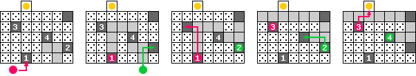 FIRST CHALLENGE TOMB: The doorway with the red lights to the NW is another optional Challenge Tomb. Inside is a spike field with 4 pressure pads. To cross the spikes, have one player step on the pressure pad nearest the entrance. (It doesn't matter who does what, but let's say it's Lara, represented by the pink dot in the diagram below, and the first pad is #1.) This retracts the spikes leading to the nearest pressure pad on the right (#2).