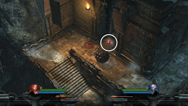 BROKEN STAIRS AND GIANT BALL: Start up the stairs to the left (NW). Unless you're going for the Score Challenge and need every point, don't worry too much about picking up gems or fighting enemies—skeletons and bogmen mostly but also a few shamans and ogres. Just go as fast as you can to the top. Avoid or jump over the gaps in the stairs and watch out for poison pods and rolling balls. (screenshots)