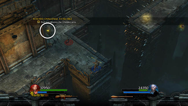 Continue NE to the end of the walkway. Just around the corner to the left, you'll find the first hidden urn (1/3) you must smash for the Reward Challenge. The on-screen message about hidden urns is a tiny clue. ;) (screenshot)