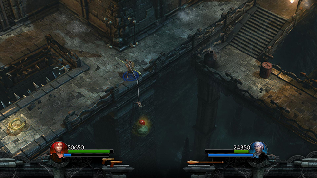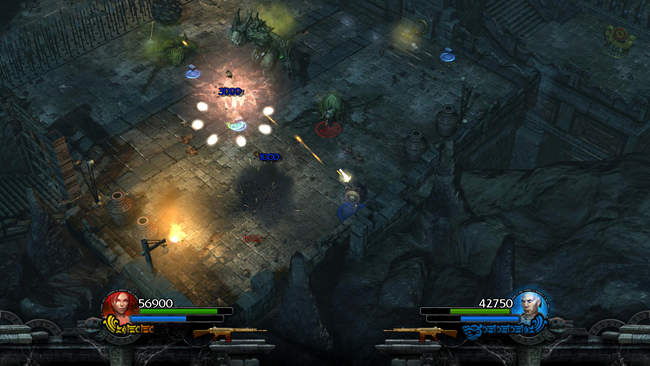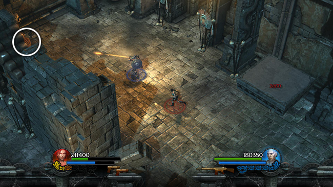 As your characters move forward, Totec on the left, Lara on the right, a giant swamp ogre appears behind Totec. More enemies, including skeletons and bogmen, spawn on both walkways. If you use careful teamwork, Totec can run forward and lure the ogre onto the spike field, which is retracted at first. Lara can then raise the spikes by moving onto the large pressure pad on her side. You don't get points for enemies killed by spikes, though, and approaching the pad causes more bogmen to spawn. So it might be easier to just stand your ground and shoot the enemies as they appear. Don't forget to blow up the skeletons' bones so they stay dead. (screenshots)