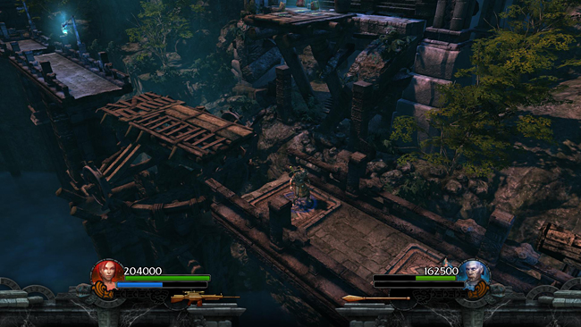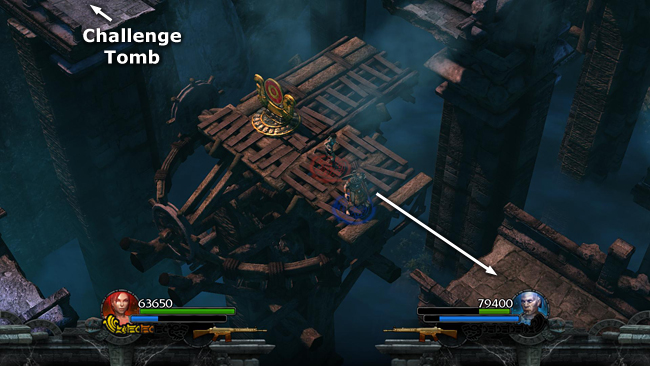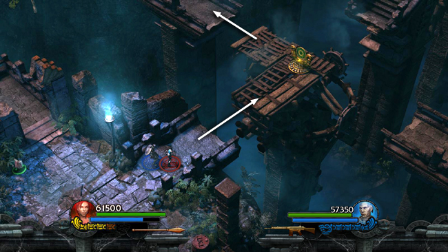 The exit from this room is on the NW wall. To open it, begin by having one character stand on the pressure pad on the right to raise the first of 2 wooden ledges to the NE. The other character should then jump onto this ledge and move to the top corner. As the first character moves onto the left pad, the other character needs to jump quickly onto the second ledge as it rises and the first collapses. He or she can then pull the handle to open the exit. As soon as you release the handle, it begins to retract. You must now move quickly to reach the door before it closes. The first character should move back onto the pad on the right. The second character must then jump back onto the first ledge as it rises and the other ledge collapses. Now jump back down to the floor and run through the exit before it closes. If you don't make it in time, you'll have to pull the handle and try again. (screenshots)