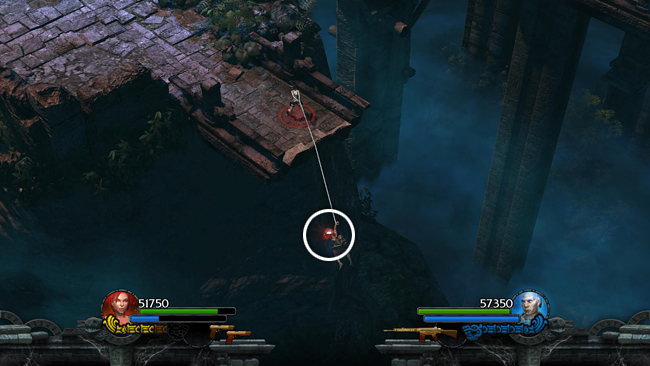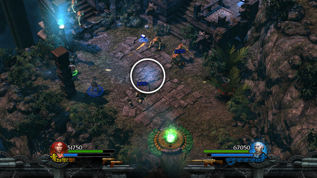 Lara should then hop over to the platform with the circular pressure pad just to the right (E). This raises the folding platform to the NE of Totec's position. He can then climb up past the golden ring, jump onto the folding platform and then jump from there to the solid platform to the left. Two shamans now appear. Each character can deal with one of them.