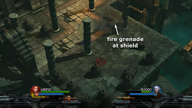 DUNGEON ROOM WITH PILLARS AND TILED FLOOR: As you enter this room, a message is displayed about a Reward Challenge: Knock the shield off a shield demon. When you move out into the room (surprise!) a shield demon appears. This new enemy type is basically an ogre dressed up with a big shield. To remove the demon's shield, equip the grenade launcher and lob a grenade at him from a safe distance. (You can also use a remote bomb, but it may take several attempts.) Destroying the shield earns you an AMMO POWERUP. Then you can finish off the demon with any weapons you like. (screenshot)