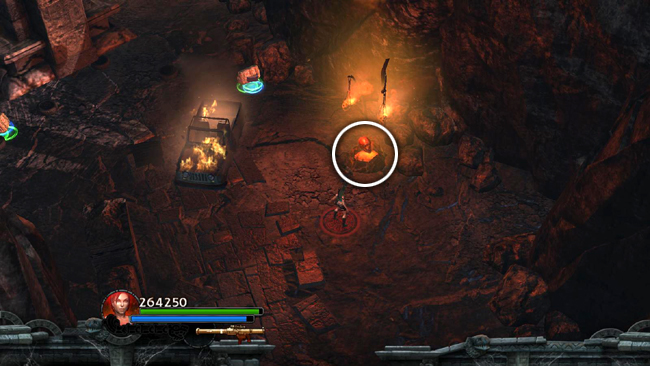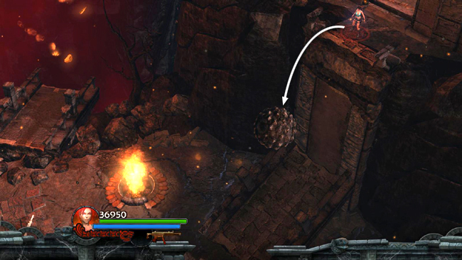 After gathering the skulls, head for the area with the second large ball and pressure pad, near the northern corner, just below where you found the 5th red skull. Another fire golem materializes here and lava boulders fall from the ceiling.