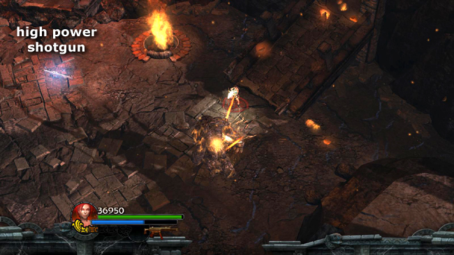 LOW AREA WITH FIRE PIT: When you're ready to move on, roll the large ball out the door and off the ledge to the SW. (screenshot) Then drop down after it. When Lara hits the ground another fire golem leaps down from the ledge on the right. If you need more firepower, grab the HIGH POWER SHOTGUN sitting in plain sight. (screenshot) Try to stay within this area as you fight it, since climbing the stairs to the south will trigger more enemies.