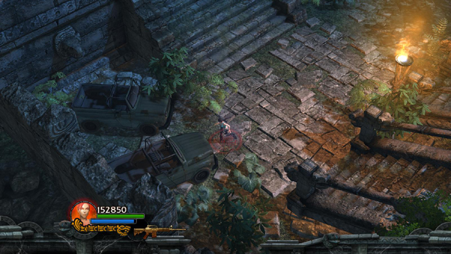 Now follow the stone road leading away from the stairs where you started. Soon you'll come to a clearing with some trucks. After a short cut scene showing Xolotl's undead warriors slaughtering some mercenaries, prepare for an onslaught of enemies from the NW. The shamans fire blue energy beams, which you should try and dodge if possible. The square columns also offer some cover. Watch out for various lizards that spawn around you as you fight the larger enemies.