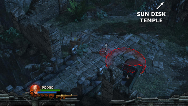 NOTE: If you didn't climb the staircase leading to the SUN DISC TOMB earlier and trigger the rolling stone ball and various enemies, that will happen when you descend after exiting the tomb. This is described in the section "AREA EAST OF SPIDER TOMB," above.