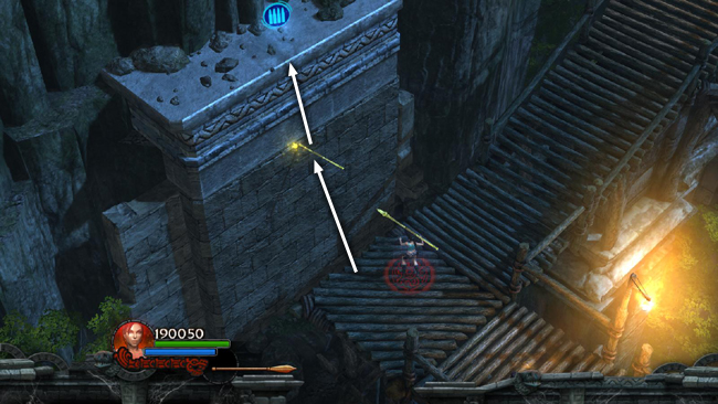 LONG, WOODEN RAMP: Continue to the SW. Follow the stone walkway to its end and then drop down onto the wooden walkway below. (This is the northwestern most area on the level map.) Go down the ramp and stop on the first landing. Throw a spear into the wall and climb onto the ledge to get an AMMO UPGRADE. (screenshot) Carefully drop down onto the spear and hop back to the wooden ramp. Continue to the bottom.
