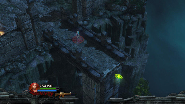 Now return to the elevated walkway to the NW. If you didn't trigger them earlier while fighting the lizards, several regular enemies will appear here. Deal with them and then follow the walkway back to the gap where you found the health pack earlier. Jump across the gap and then drop down to the ground. (screenshot)