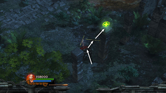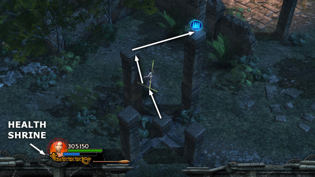 Now return to the clearing to the NE, where you'll find a HEALTH SHRINE. There are also five square columns with an AMMO UPGRADE on top of the tallest one. To reach it, stand on the center pillar, throw a spear into the pillar to the NW and use it to climb onto that pillar. Jump from there to the pillar with the upgrade. (screenshot)