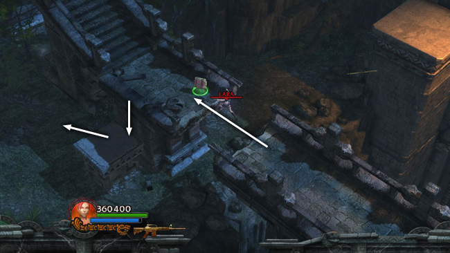 NOTE: If you're not interested in all the pickups and Reward Challenges—or if you're trying for the 5-minute Time Challenge—you can skip the rest of this area. Drop down on the left, climb back onto the elevated walkway and return to the SPIDER TOMB (and pick up the walkthrough below at the section titled "RETURN TO THE SPIDER TOMB.")
