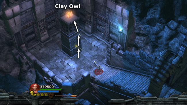 Enter the tomb to find a tall, square pillar with something shiny on top. Throw 2 spears into the pillar—one from the stairs and one at ground level—and use them to reach a Clay Owl Artifact (+ defense, - bomb). (screenshot) Exit the way you came.