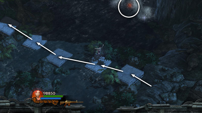RIVER CROSSING: Just beyond this gap in the wall there's a spot in the river with a series of small, square stones. This is a good spot to try and cross the river without touching the water for the Reward Challenge. (screenshot) After hopping across, you'll need to move up onto the opposite bank in order for the challenge to register. If you don't make it the first time, you can return to the area where you found the AMMO UPGRADE and try crossing again. Success brings a HEALTH POWERUP.