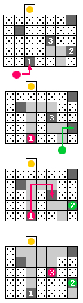 FIRST CHALLENGE TOMB: The doorway with the red lights to the NW is another optional Challenge Tomb. Inside is a spike field with 4 pressure pads and 2 large balls. To cross the spikes, begin by pushing the ball on the left (the pink one in the diagram) onto the pressure pad nearest the entrance (#1 in the diagram). This retracts the spikes leading to the nearest pressure pad on the right (#2).