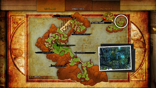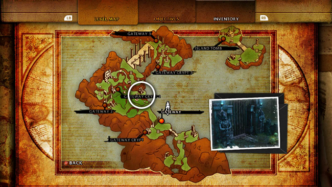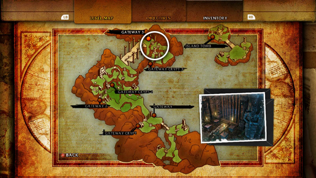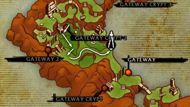 If you're not interested in challenges and loot, you can immediately enter the SECOND GATEWAY CRYPT, which is the doorway with the blue light shown in the last cut scene. (screenshot) It's also marked on the level map. (Skip down to that section of the walkthrough, below.)