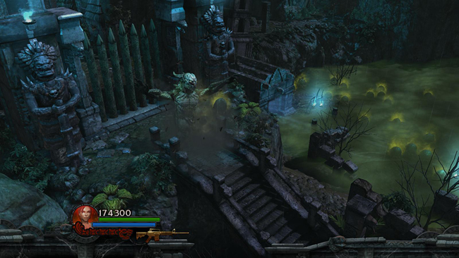 When you descend the next flight of stairs to the south, a giant swamp ogre appears, along with some bogmen and other enemies, including a shaman. You may want to retreat up the stairs to the north as you fight, to avoid setting off a stink-pod chain reaction in this area. Don't drop down off the wooden platform to the left yet, though, as this will just trigger more lizards, making the fight harder than necessary. Afterward, pick up the health/ammo the giant drops, plus another health pack at the south end of the clearing.