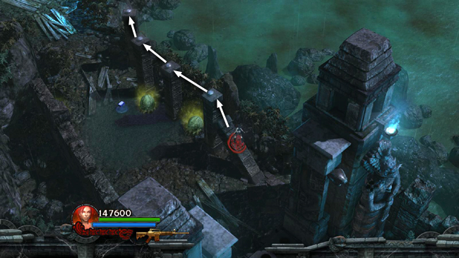 NOTE: When you first obtain the ball, instead of rolling it toward the crypt, you could also blast it up the tiered edge of the drained pool onto the elevated pathway to the west. This is tricky though, and more often than not the ball overshoots the path and lands in the pit at the base of the tall tower, making it difficult to move without triggering the nearby pods. I found it much easier to use the wooden walkways and ramps.