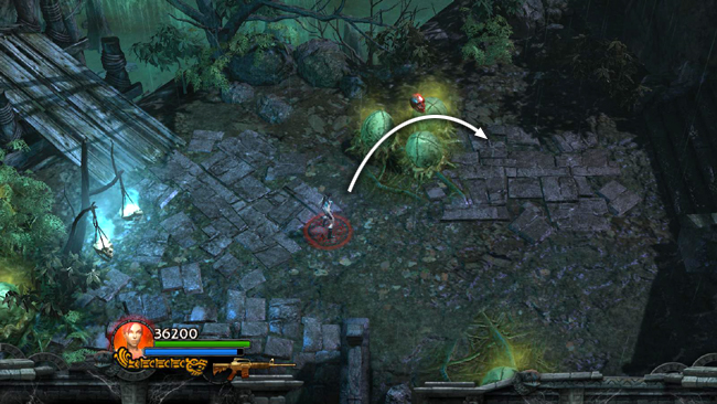 When the movie ends, several of the nearby pods burst, releasing bogmen. These humanoid creatures aren't hard to kill but explode when they die, releasing clouds of the same toxic gas that comes from the pods. More bogmen and lizards soon join the fight. If things get too intense, retreat across the wooden bridge. Then you can bomb/shoot a few enemies at a time as they approach.