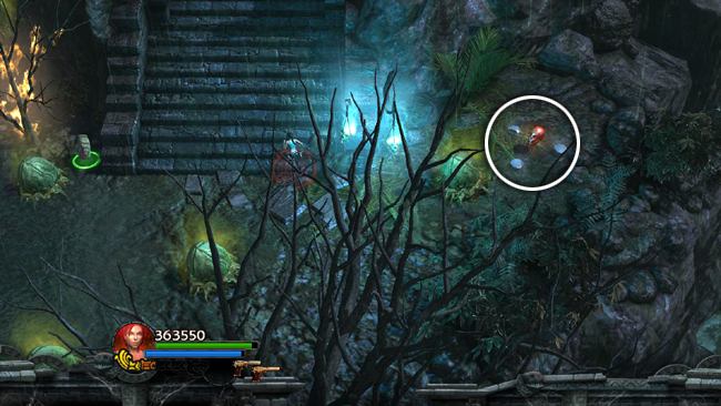 Continue to the north until you come to a flight of steps. There are gems in the bushes to the right of the stairs. At the top you'll find a red skull (1/10) hovering above a cluster of pods. To get it, leap over the pods and move out of the way before they burst. (screenshot) Then climb the stairs to the right (E).