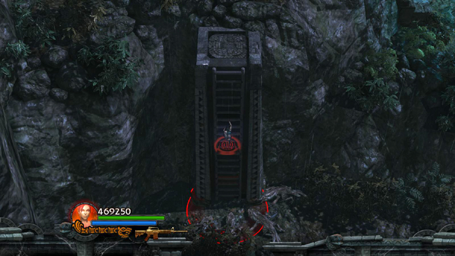 LEVEL EXIT: Cross the rickety plank bridge to the NW. After a short cut scene in which Xolotl taunts Lara once more, approach the overgrown ruins. The pods in this area are not active yet. So if you're not doing the time challenge, take a minute to explore this small island gathering gems. Go up the stairs on the left and circle all the way around back to emerge on the ledge to the right of the big door.