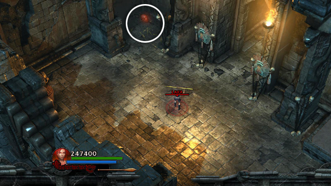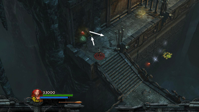 There's an ogre at the top of the stairs but, again, you only need to kill him if you're after the points. Otherwise, step on the pressure pad to release the giant ball balanced above. When it falls, it will squash the ogre. But before that happens, you need to run as fast as you can back down the stairs. Avoid enemies, pods and holes in the floor. At the bottom, veer onto the broken walkway to the SW to get out of the way as the giant ball crashes through the wall on the right.