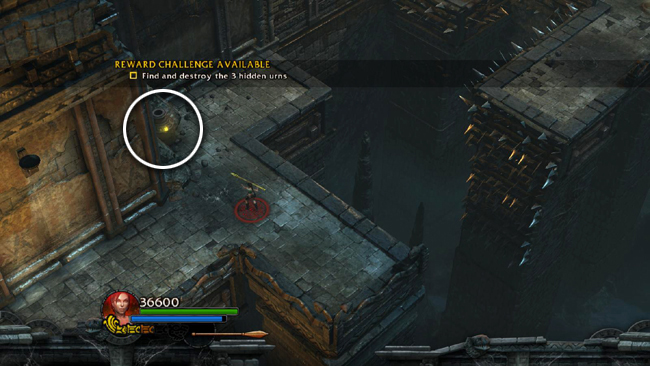Continue to the end of the walkway. Just around the corner to the left, you'll find the first hidden urn (1/3) you must smash for the Reward Challenge. The on-screen message about hidden urns is a tiny clue. ;) (screenshot)
