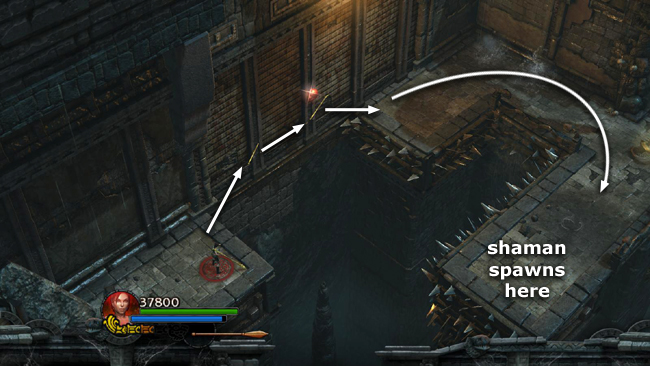 AMBUSH ROOM WITH SPIKES & ARROW TRAPS: Bars close over the doorway behind you. As you approach the middle of the room an ogre and a bunch of lizards appear, then several regular enemies, followed by a long-haired ogre, some bogmen, a pair of shamans and a couple of skeletons. If possible equip a relic that gives you weapon bonuses and try to avoid taking damage as you spray the room with bullets. If you can raise your relic meter enough to trigger a relic power like power shot and/or scatter shot, you can make short work of most of these enemies. Needless to say, you'll want to avoid the pods and the flying arrows on the far side of the room. Don't forget to finish off the skeletons with bombs, so they won't keep rising up to bother you.