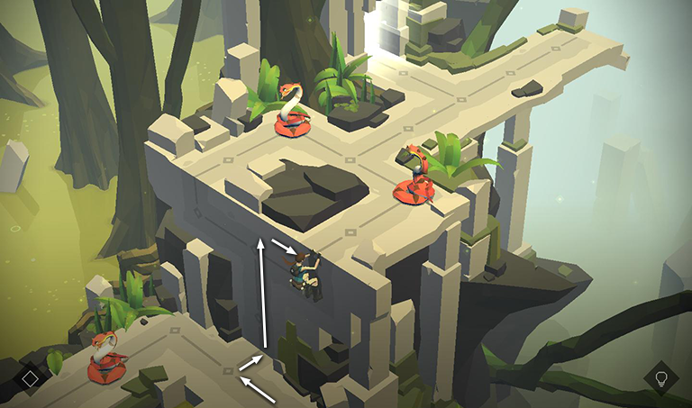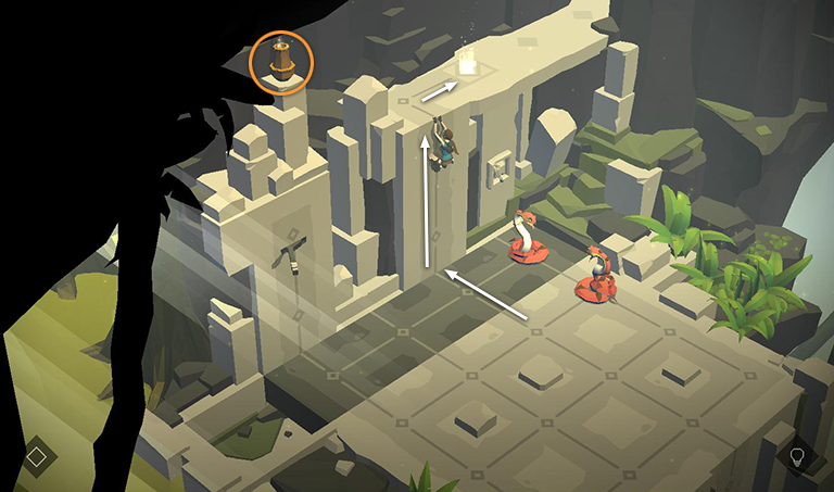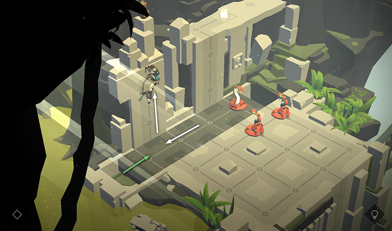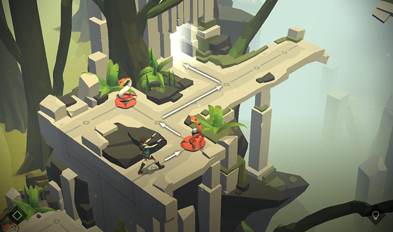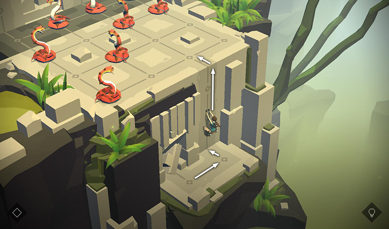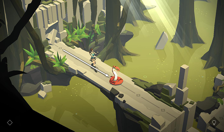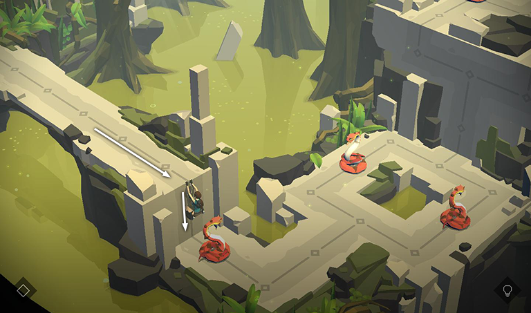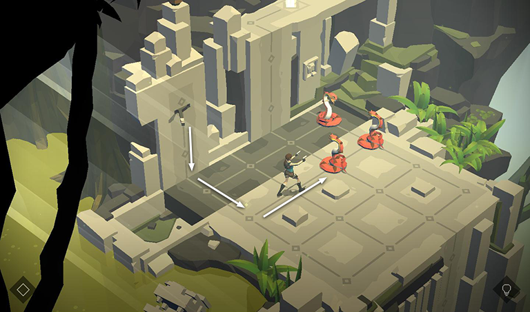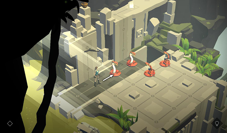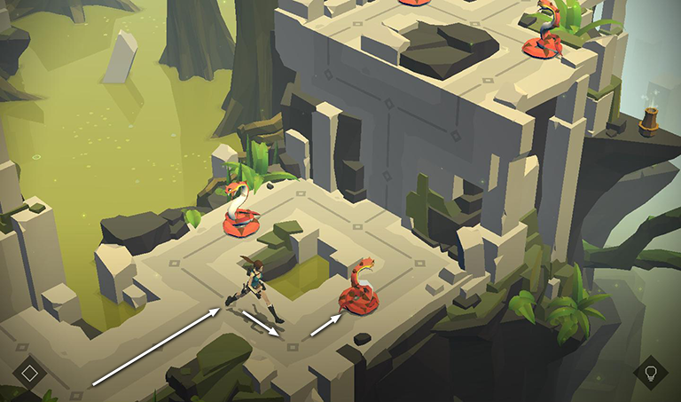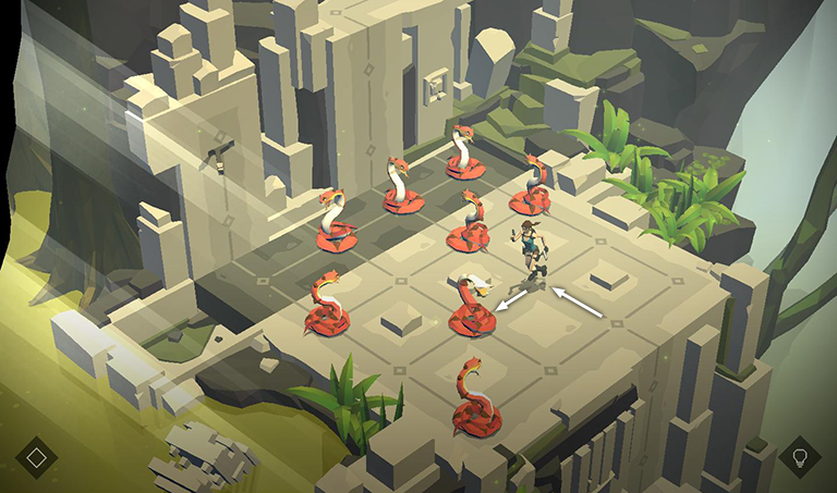 There's a snake blocking the path ahead. Enemies like this can kill Lara if you are not careful. Since the game is turn-based, the angle of approach is crucial. Notice how the snake is oriented, facing away from Lara. As long as you approach from behind, you'll be safe. Swipe to move toward the snake and Lara will automatically shoot it clearing the path.