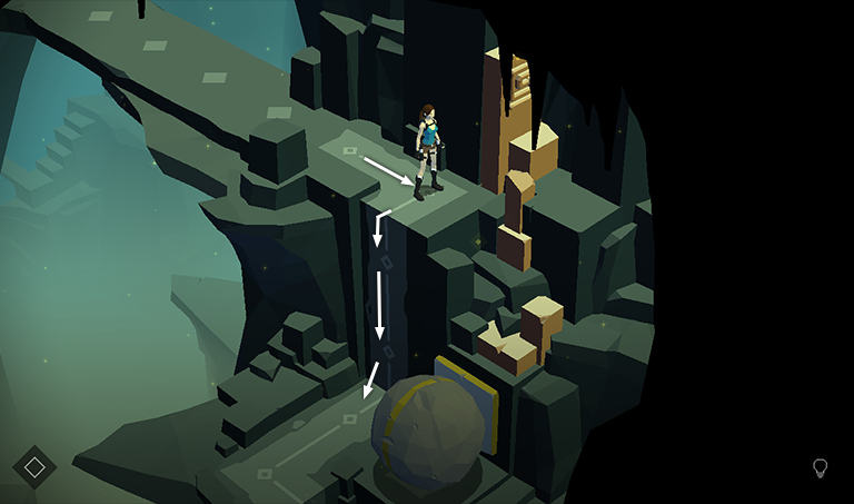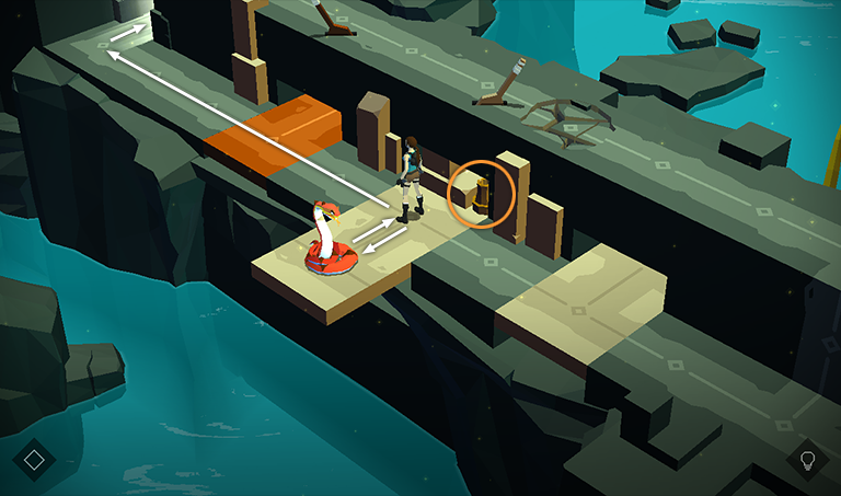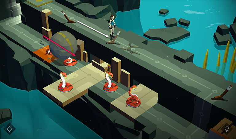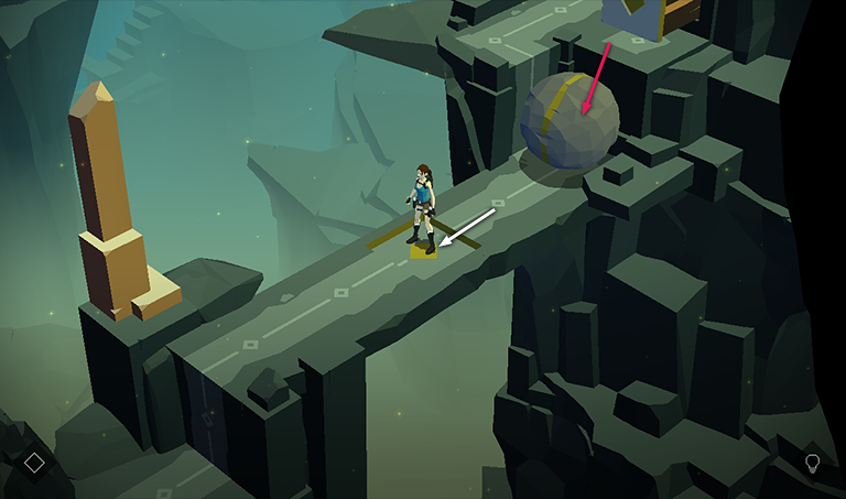 When Lara steps on the pressure pad with the yellow diamond, the block trap behind the boulder is activated, pushing the boulder off the ledge. Like Lara, the boulder only moves once per turn, so as long as you stay ahead of it, you're safe.