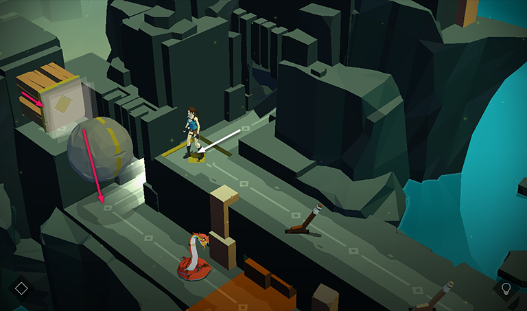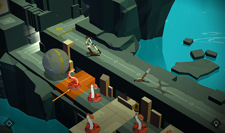 Move to the right until Lara is standing next to the first lever. As you go, the boulder rolls two spaces to the right, squashing the first of several snakes on the ledge below.