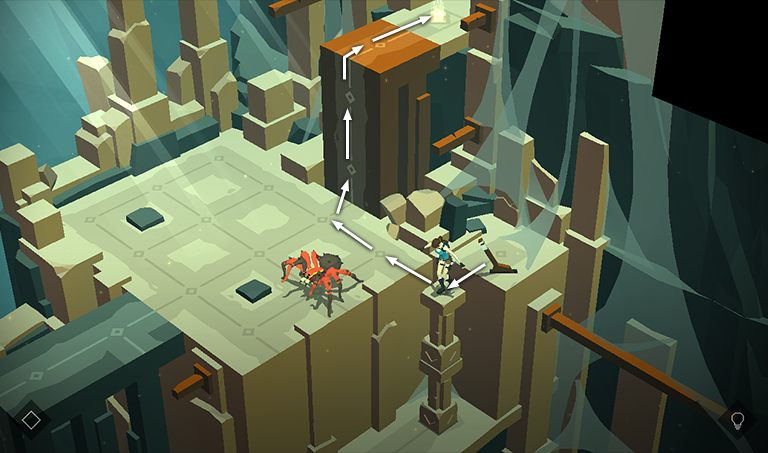 Now push the pillar forward twice. The first push moves it into the spider's path. The second push sends it off the edge onto the ledge below.