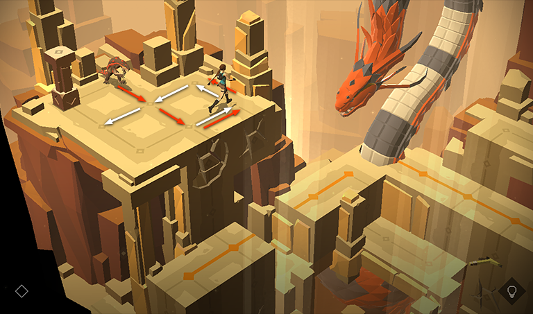The lizard notices Lara immediately. To outsmart it, move to the right, then forward, then left twice, until Lara is standing just below the movable pillar. The lizard follows two spaces behind.
