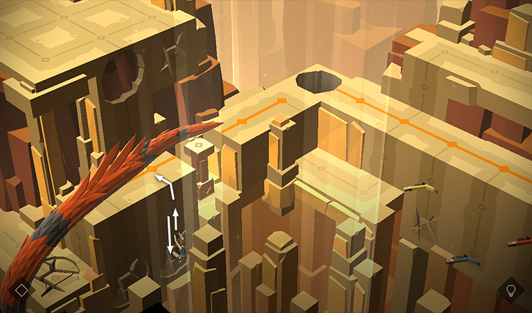 Move to the right along the orange line. Then climb up, past the cracked wall, onto the ledge with the lizard. Meanwhile the QUEEN makes her way back around to the hole where she started.