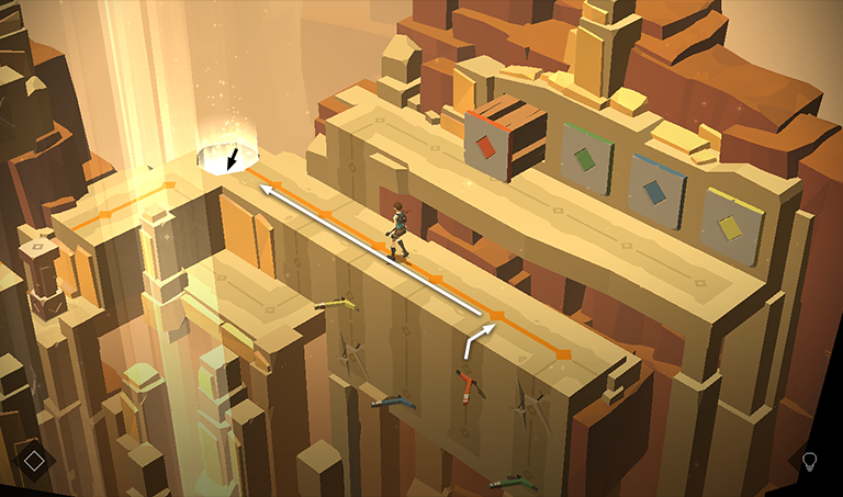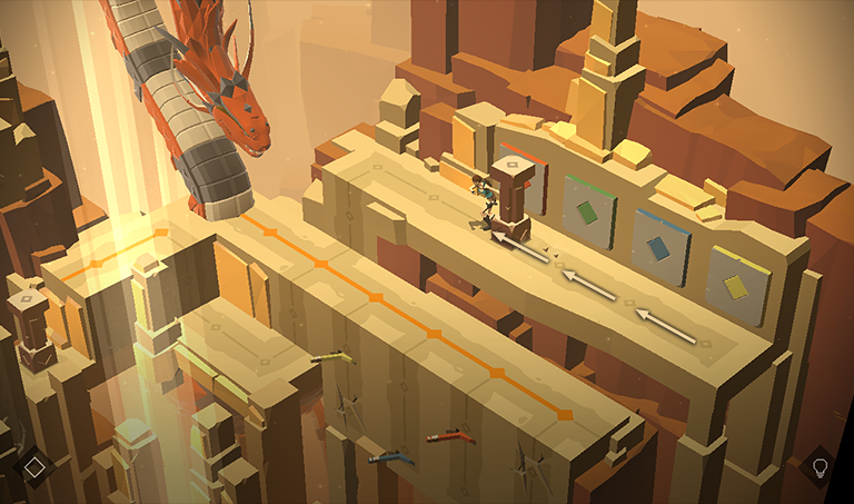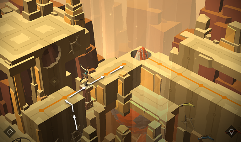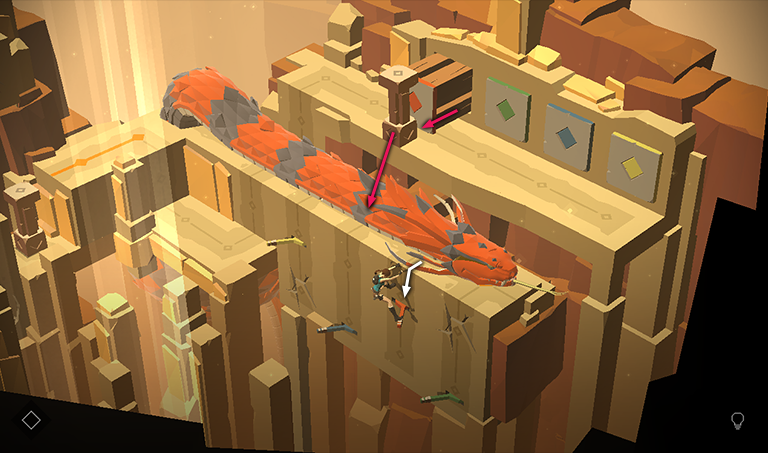 Push the pillar off the ledge so it lands in the gap in the walkway midway along the orange line. Meanwhile, Her Royal Nearsightedness continues to lurk off to the right.