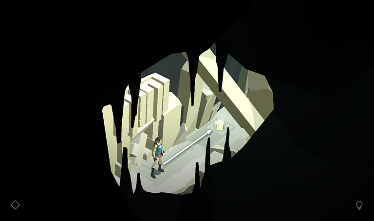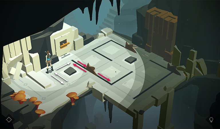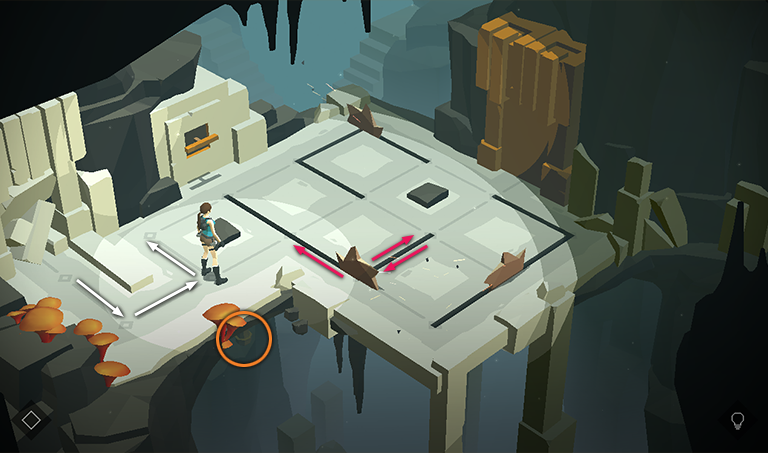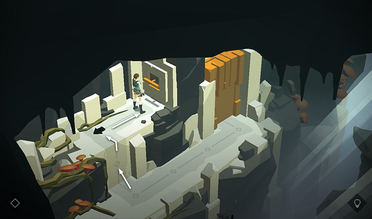 Then pull the switch by tapping/clicking the arrow icon on the floor. (If you're using a controller, hold Y/Triangle and move the left stick to pull the switch.) This opens the door off to the right. As you'll see, as soon as Lara moves again, the switch begins to retract and the door begins to close. You'll have six turns to reach it before it shuts completely. If that happens, you must to return to the switch and pull it again.