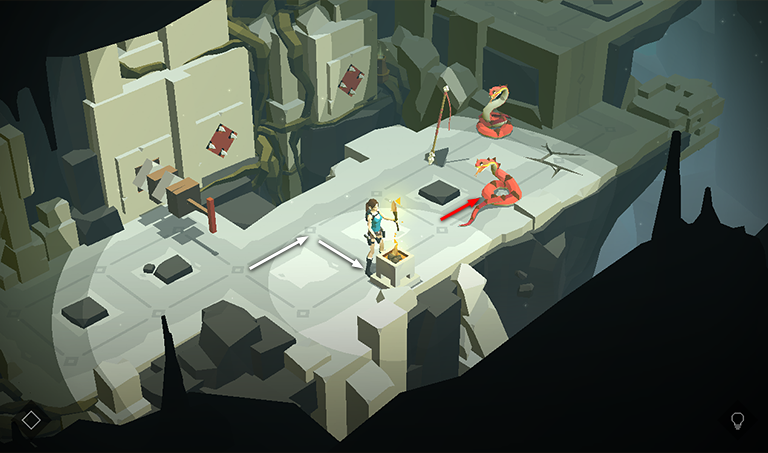 Hop back across the pillar and follow the ledge around to the right. With torch in hand, Lara can pass safely in front of the snake.